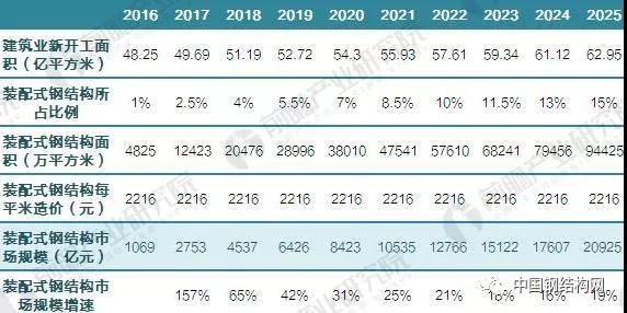 另外,按照政策的普遍要求,未來十年內(nèi)“裝配式建筑將占新建建筑面積30%、裝配式鋼結(jié)構占15%”的比例,預測新增住宅面積每年提高3%,以10年為周期,以現(xiàn)有的裝配式建筑平均價格計算,2025年裝配式鋼結(jié)構的市場規(guī)模將達到2萬億元。